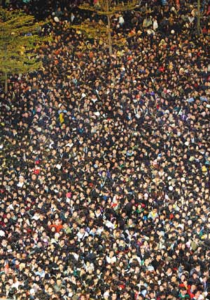 參加昨晚在臺北市政府舉行的“2008臺北最High新年城”跨年晚會的民眾,將舞臺附近擠得水泄不通。(聯合報圖)