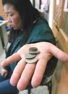 據臺灣《聯合報》報道,四十三歲的陳女昨天在警局翻遍全身口袋,僅有三十二元。“這是我全部的積蓄,要留給媽媽下一餐。”說完,陳女淚水立刻滑下。警察見狀不忍,掏腰包買面包請她吃,她抹淚紅著眼狼吞虎咽,似乎餓壞了。