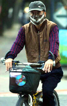 圖為一位民眾九日戴著口罩在中山紀(jì)念館騎車(chē)運(yùn)動(dòng),以免受到污濁空氣的影響。圖:臺(tái)灣《中國(guó)時(shí)報(bào)》