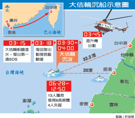 從廣州經香港欲前往臺中港的巴拿馬籍貨輪“大佶輪”,昨日凌晨在臺灣海峽沉沒。臺中海巡隊分析,可能是貨艙沒有密合或是有破裂,大浪打上甲板海水流入貨艙,造成載重增加。由于該貨輪可能會造成燃油污染,臺中港務局已通報環保部門處理。