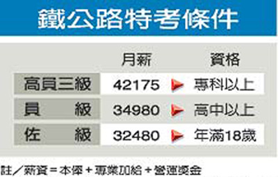 臺灣鐵、公路特考薪金情況。月薪單位:新臺幣。 來源:臺灣《聯合報》