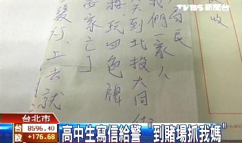 中國(guó)臺(tái)灣網(wǎng)4月2日消息 據(jù)臺(tái)灣TVBS報(bào)道,臺(tái)北市一名高中男同學(xué),受不了母親每晚外出賭博,鼓起勇氣寫信到北投警分局求救,拜托救救他們一家人,還直接寫下母親賭博地點(diǎn),警方循線果然破獲隱身在民宅內(nèi)的賭場(chǎng)。