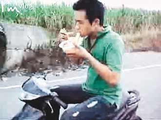 兩名男子互拍對方放雙手騎機(jī)車,還邊騎邊吃泡面、喝紅茶、看報(bào)紙