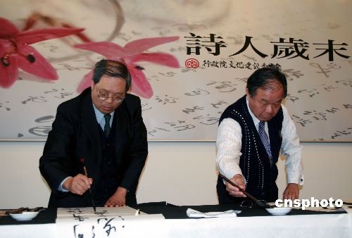 中新社臺北十二月十一日電 (記者 周兆軍 劉舒凌)洛夫、痖弦、周夢蝶、楊牧、楚戈等臺灣代表性詩人十一日齊聚臺北,出席臺灣“文建會”舉辦的“詩人歲末雅集”,并揮毫書寫各自名句,授權“文建會”制作相關文化產品,助推臺灣文化創意產業。