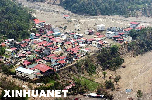 8月22日航拍的臺灣高雄縣那瑪夏鄉民生村受災情況。
