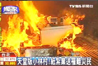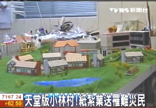 中新網9月4日電 臺灣“八八水災”毀了高雄縣小林村,3日正逢中元節,臺北縣有家專門制作“天堂配件”的紙扎公司,為讓死者安息,連夜趕工蓋出“天堂版小林村”,里頭除了住家、學校以及商店街,希望火化后,能讓不幸的罹難者,在天上有棲身之地。
