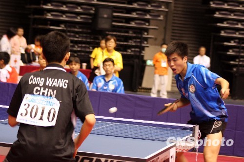 9月6日,第21屆聽障奧運會賽事首日,中國隊全面出擊,參加乒乓球、籃球、羽毛球等多個項目比賽。上午在臺北小巨蛋率先登場的乒乓球男團比賽,3名中國聽障小伙子出場,3:0擊敗中國香港隊。圖左為中國聽障運動員王聰。 中新社發 董會峰 攝