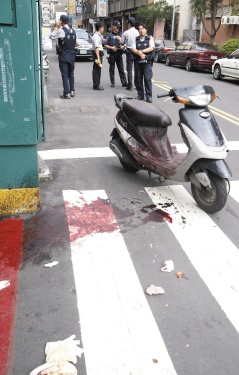 高雄火車站前昨警匪槍戰(zhàn),雙方互開20多槍。通緝犯劉傳成小腿多處中槍血肉模糊,現(xiàn)場遺留滿是血跡的摩托車。 (圖片來源:臺灣《聯(lián)合報》)