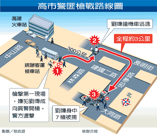劉傳成一度中彈跌倒,馬上又爬起,邊逃邊朝警員開槍,轉(zhuǎn)入附近林森一路商店街內(nèi),看到停在路旁的摩托車鑰匙沒拔下,搶走摩托車繼續(xù)逃。警察連開好幾槍,他仍負傷逃逸,警察隨即以無線電通報警網(wǎng)圍捕。