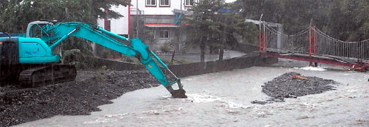 災(zāi)情最嚴重的是冬山鄉(xiāng)的太和村,上游的十三份溪在上次芭瑪臺風來襲時,溪里大量土石淤積,還來不及全部清除,這次又逢大雨,溪水暴漲淹到路面,多條農(nóng)路封閉。縣府工務(wù)處緊急出動3臺挖土機疏浚十三份溪,避免溪水的水位持續(xù)升高,造成更嚴重的災(zāi)情。