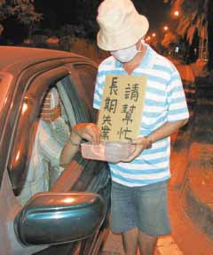 高雄市街頭最近一個多月來出現新的“化緣族”,他們戴帽子、口罩,向停車等紅燈的汽車駕駛人“化緣”。圖片來源:臺灣《聯合報》