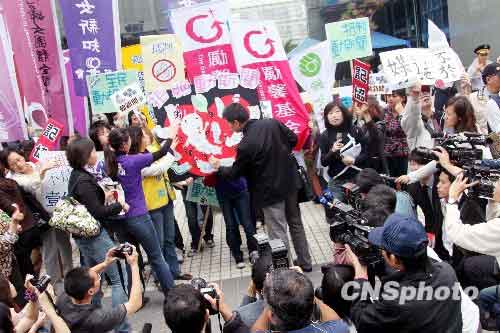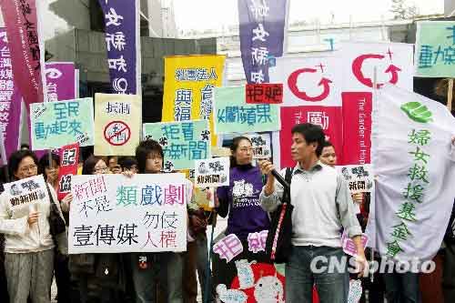11月26日,臺灣數10個社會團體到臺北壹傳媒大樓,抗議該媒體推出的“動新聞”內容涉及膻色腥、暴力和有侵犯隱私之嫌,臺北市政府和臺灣有關方面也正陸續出臺處罰措施。圖片來源: 中新社 黃少華 攝