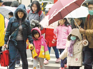強(qiáng)烈寒流來襲,清晨家長(zhǎng)帶著小朋友上學(xué)時(shí),都穿上厚重的冬衣。(圖片來源:臺(tái)灣《聯(lián)合晚報(bào)》)