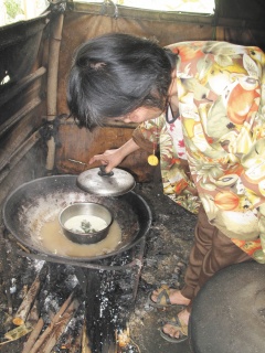 簡陋破落帳篷搭在香蕉園里,卓姓夫妻與兒子擠在不到兩坪的空間里;室內堆放著臟亂衣物等用品,睡覺的地方用木板稍隔開,陳設比起工寮還要簡陋。緊鄰廚房僅有一只燒柴鍋子,卓家女主人鍋子正在蒸蛋,蒸蛋的水暗沉,她說:“這是早餐。”