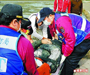消防隊(duì)員將受傷的黃世駒抬上擔(dān)架送醫(yī),經(jīng)敷藥后黃已返家。來(lái)源:臺(tái)灣《蘋(píng)果日?qǐng)?bào)》