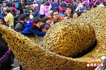 南投紫南宮昨擁入逾10萬名信眾,搶著滾動藤編金元寶,祈求財源滾滾來。來源:臺灣《蘋果日報》