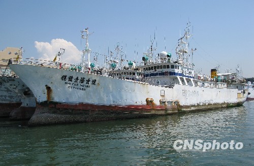 去年4月在西印度洋遭索馬里海盜挾持的臺灣遠洋漁船“穩發161號”,歷經各方營救,終于在遭挾持10個多月后,包括船長顏勝男等共28人返回高雄港。圖為“穩發161號”現停靠高雄前鎮漁市場碼頭。 中新社發 耿軍 攝