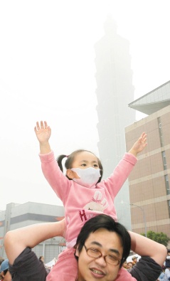 臺北101大樓籠罩在沙塵之中,家長為小朋友戴上口罩。圖片來源:臺灣《聯(lián)合報》