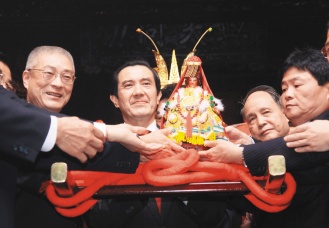 馬英九(中)昨天到鎮瀾宮親送媽祖上鑾轎,吳敦義(左一)、鎮瀾宮董事長顏清標(右一)等扶持。來源:臺灣《聯合報》