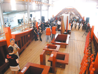參觀者在仿造的鄭成功船上觀看 來源:臺灣《聯合報》