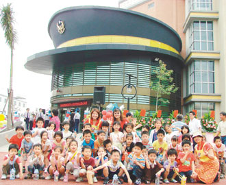 臺(tái)南縣新化警分局新建辦公廳舍昨天落成,戴警帽造型獨(dú)一無(wú)二,幼兒園小朋友參觀覺(jué)得新奇有趣。圖片來(lái)源:臺(tái)灣《聯(lián)合報(bào)》