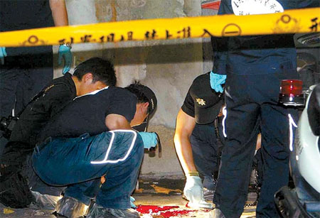警員莊志強在停車場開槍誤傷派出所長后自殺,留下大片血跡,鑒識人員到場采證。來源:臺灣《蘋果日報》