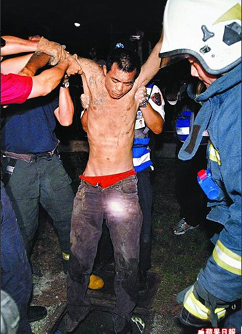 救援的警消無法鉆入,只能將頭伸入水溝內對他喊話。圖片來源:臺灣《中國時報》