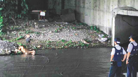 賴姓游民在溪中洗澡時滑倒,泡在水中數日,他養的兩只狗一直守在旁邊,警方據報有“浮尸”,趕到搶救。圖片來源:聯合報