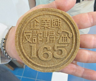 會場背景還有一塊長5.4米、高1.2米的巨型姜餅,連門市賣的綠豆?jié)櫢舛加∩稀?65保錢財”、“保平安”等愛心警語,用特制食品讓“反詐騙吃下肚”、增加印象。(中國臺灣網 張辰劍)
