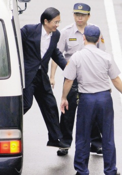 陳水扁走下臺北看守所車輛,在警員監(jiān)看下步入法院。圖片來源:臺灣《聯(lián)合報》