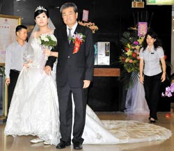臺灣前竹聯幫幫主趙爾文24日晚間在臺北市王朝大酒店,舉行小女兒婚禮及自己70歲壽宴,趙爾文挽著愛女緩緩步入禮堂接受親友祝福。圖片來源:臺灣《中國時報》