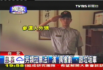 中國臺灣網10月9日消息 據臺灣TVBS電視臺報道,“五都”(臺北縣升格后的新北市、臺北市、縣市合并后的大臺中市、大臺南市和大高雄市)選戰進入倒計時階段,市議員參選人抓住最后時機,拼人氣搶選票,絞盡腦汁用盡各種辦法跟選民拉近距離。有的參選人憂慮自己知名度不夠,索性自導自演影片,劇本跟拍攝手法媲美偶像劇,很有質感,借此來拉攏年輕選民;有的參選人則跟著垃圾車拜票,哪里有人就往哪里去,到人群集中的地方拉選票。