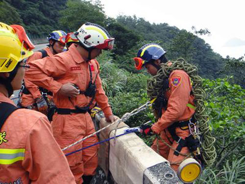 臺北市搜救隊24日挺進蘇花公路116公里塌方處,搜救隊員從陡峭山壁垂降,搜尋生還者及車輛殘骸。圖片來源:“中央社”