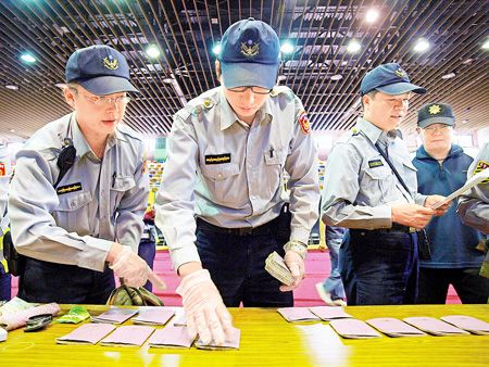 臺警方在大陸領隊田園的旅行袋內,找到20本獲救的弘泰旅行社陸客通行證,逐一清查。圖片來源:臺灣《中國時報》
