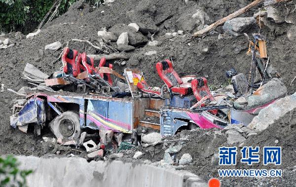 搭載湖北、貴州等地游客的旅行車(chē)被掩埋在蘇花公路114.5公里處,事發(fā)時(shí)車(chē)上人員已砸窗逃生(10月26日攝)。新華社記者 何俊昌 攝