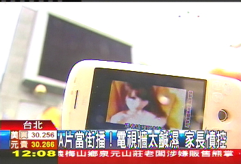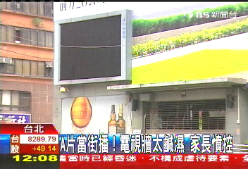 近期,位于臺北市林森北路跟長春路交叉口的電視墻,每到晚上就不定時出現限制級的畫面,如男女主角喇舌,還有咸濕特寫鏡頭等,字幕還辛辣寫著“讓你一次看個夠,月租費199元”。經過此地的車主經常看到忘我,車禍頻出。因附近小學家長擔心電視畫面對小孩造成負面影響,用手機拍下畫面投訴,“中華電信”才關閉了電視墻,并解釋是排播錯誤。