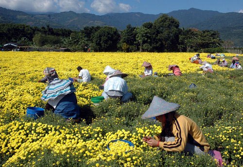 臺東杭菊進入了采收期,但2010年因氣候變遷和部分蟲害影響,杭菊收成量減少3成。圖為農民25日忙著采收杭菊,田園景色美不勝收。 圖片來源:“中央社”
