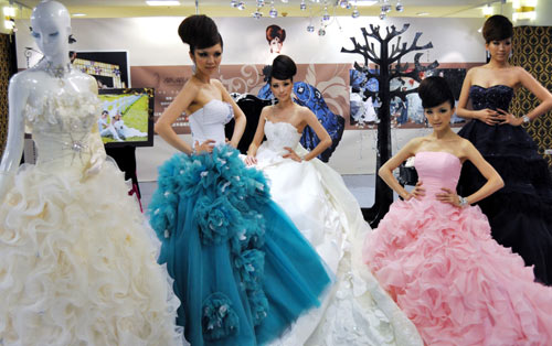高雄市多家婚紗業(yè)者為迎接年底結(jié)婚旺季,24日在高雄市聯(lián)合推出2010秋冬時(shí)尚婚紗展,由模特兒走秀展示歐系時(shí)尚婚紗禮服。 圖片來源:“中央社”