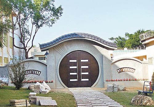 臺中監獄附設培德醫院的女受刑人重病區入口,有中式大門和圍墻外觀。