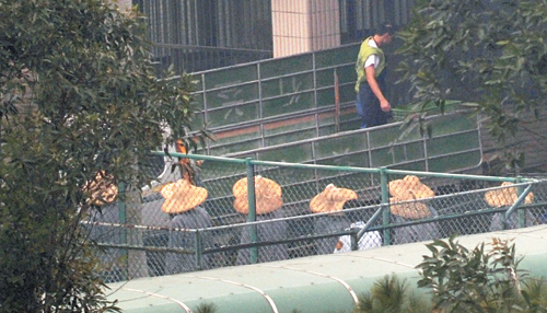 “斗笠部隊”10日曾出現(xiàn),13日又出現(xiàn)一排戴著斗笠的受刑人,成一字縱隊陪阿扁走出舍房,沿途所經(jīng)還加上綠色帆布阻隔。據(jù)了解,這些“斗笠隊”中并沒有訪客,只是臺北監(jiān)獄為掩護阿扁、避免媒體拍到容貌而刻意安排的。