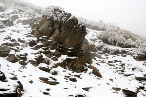 寒流發威,高山一夜間白了頭。臺灣玉山氣象站表示,合歡山及玉山26日凌晨都飄降瑞雪,合歡山從臺14甲線昆陽以上就可看到雪。圖為昆陽一帶的巖壁一片銀白景色。 圖片來源:“中央社”