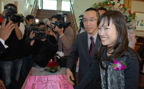 陳水扁兒子陳致中(右2)和妻子黃睿靚(右1)出席妻舅黃漢強的婚禮。圖片來源:“中央社”