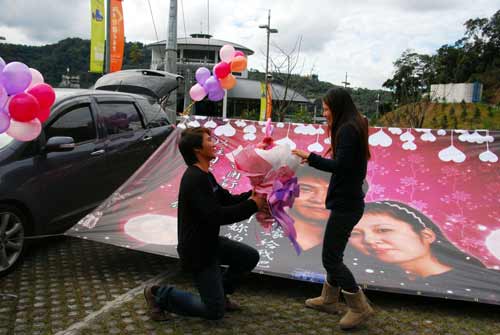 廖振坤事先與日月潭纜車公司協調求婚計劃,包下5格大客車停車空間,布置求婚大看板,上面除有兩人的放大合照畫面,并印上“讓我用行動來表達我對你的愛,請嫁給我吧”等告白字句。