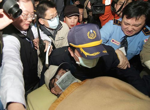 陳水扁因心臟問題,上午被送往桃園醫(yī)院戒護(hù)外醫(yī)。陳水扁躺在推床上,戴著口罩,雙眼緊閉,沒有說任何話。