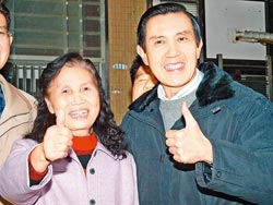 臺灣宜蘭市拾荒婦人楊黃牡丹(左)上月撿到110萬元,交付失主后堅拒酬金,讓馬英九相當感動,昨日親赴楊家拜訪,贊揚她是“臺灣之光”。圖片來源:臺灣《中國時報》