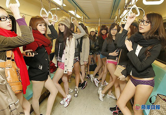 昨日為Reebok倡導的“無褲日”,20名正妹只穿內褲搭乘捷運,引起了男乘客的騷動。圖片來源:臺灣媒體