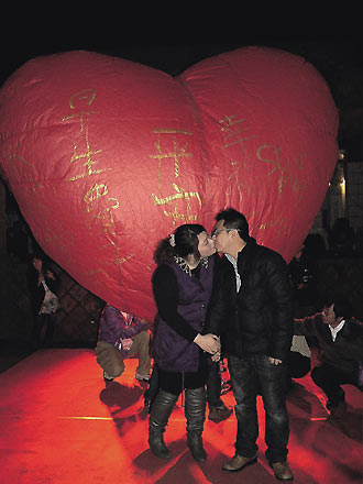 新北市昨晚在平溪區菁桐小學舉辦白色情人節放天燈活動,來自板橋的戴蓓蕾(左)向相戀8年的男友胡育銘(右)求婚成功后,兩人一起施放心型天燈。