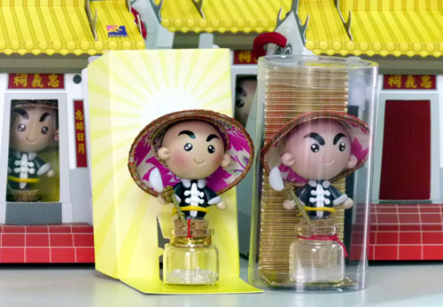 臺灣屏東六堆忠義祠推出客家公仔,主角是六堆客家烈士忠勇公,公仔頭戴斗笠、手持竹竿綁菜刀。忠義祠還準(zhǔn)備推出電音忠勇公,趕上時(shí)代潮流,成為臺“客”文化。圖片來源:“中央社”