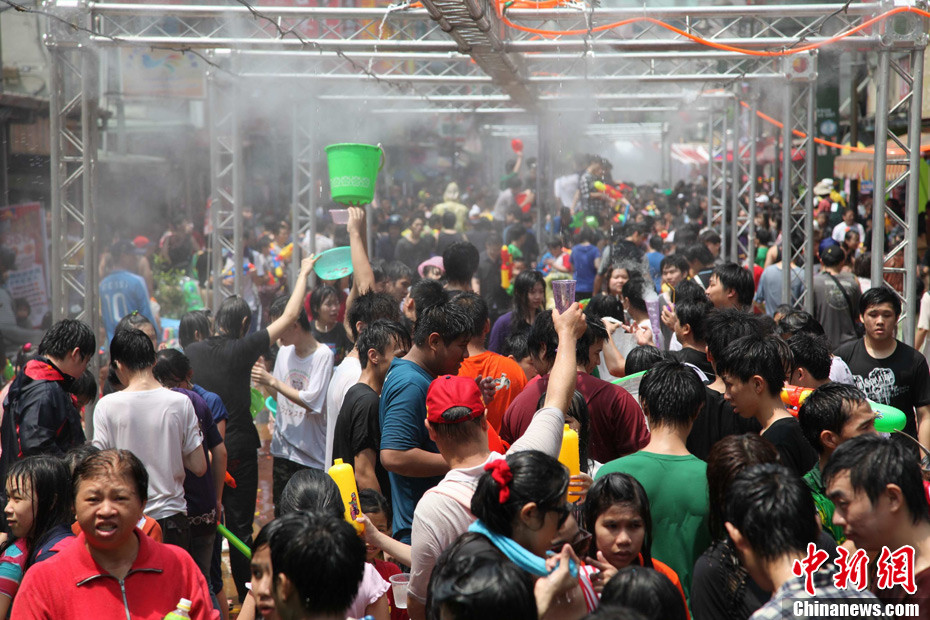 4月10日,在臺灣新北市最大緬僑街上,來自各地的數千民眾拿著水桶、水槍打成一片。據悉,每年4月的潑水節,是緬甸、泰國等東南亞國家的新年。中新社發 沈存旭 攝