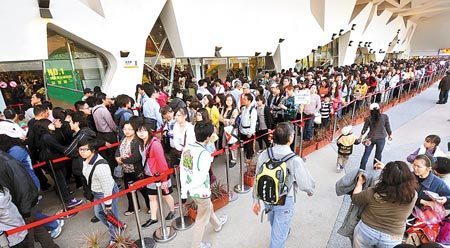 由于是花博展期的最后一個周末,拜天公作美之賜,許多入園民眾幾乎是全家動員、扶老攜幼,舉目所見,不管是在熱門展館或紀(jì)念品銷售處,都是大排長龍,擠得水泄不通。